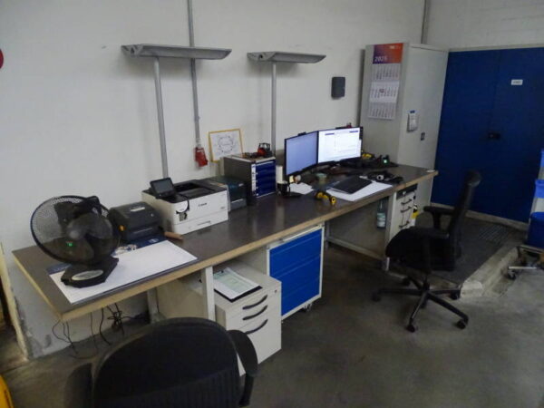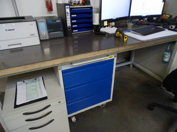 Holz, Stahlrohrgestell, Breite 400 cm, mit Arbeitsstühlen und Auszugsschränken, mit Inhalt
