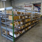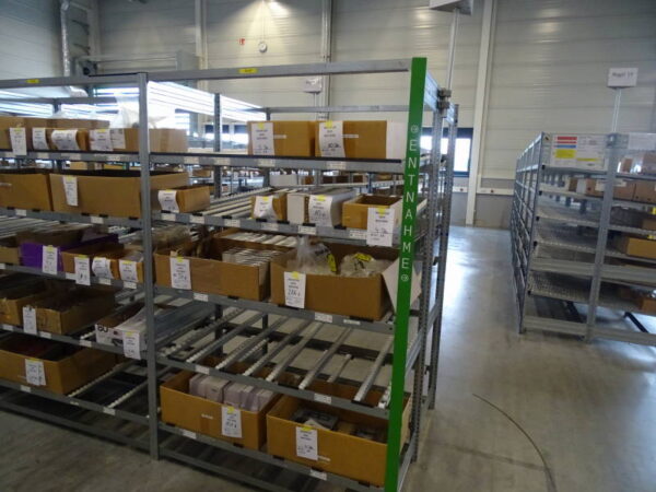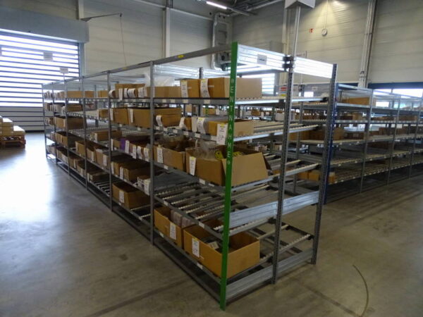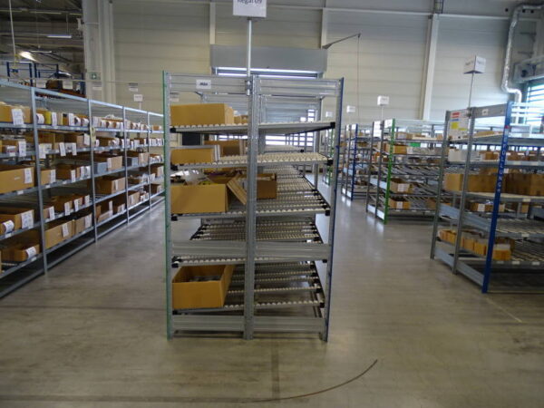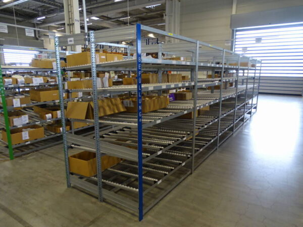 BITO Durchlaufregal mit Rollenbahnen mit Ständerhöhe: 200 cm | Ständerbreite: 125 cm | Traversenlänge: 135 cm | Baujahr 2015| Felder: 6 | Ebenen: 5 | max. Fachlast: 100 kg | max. Feldlast: 500 kg | Farbe: silber | Zubehör:
