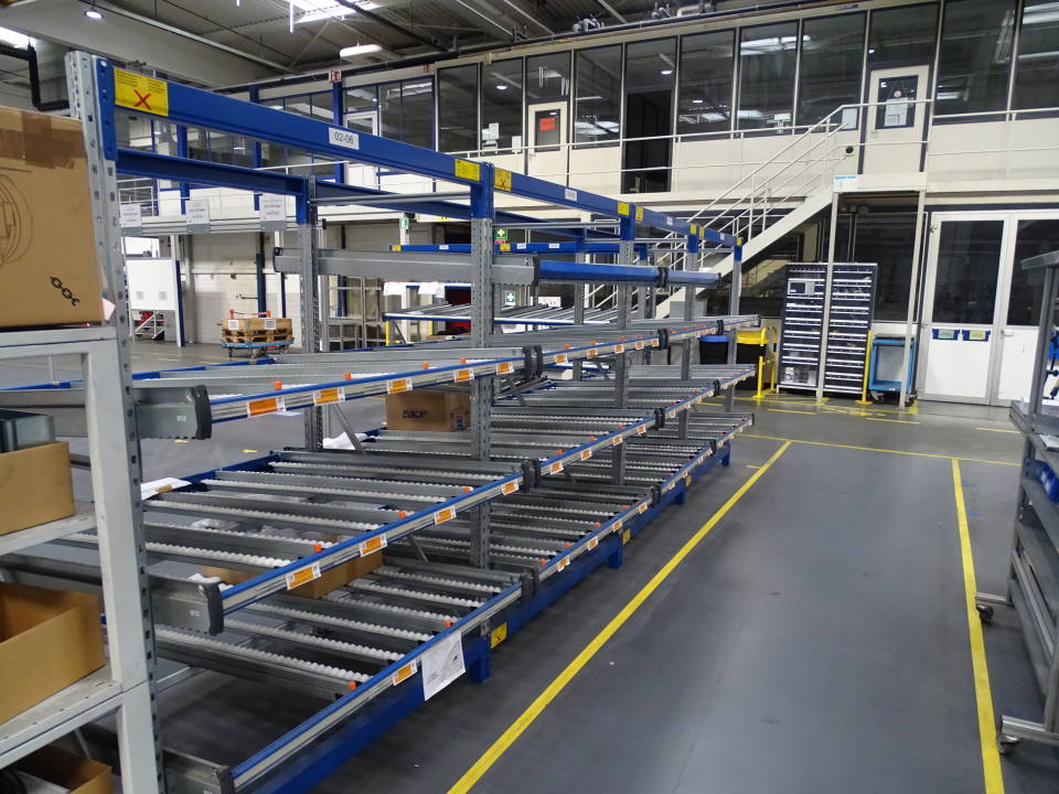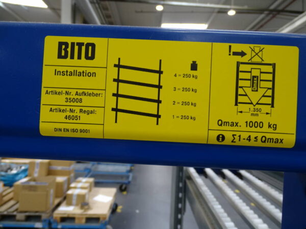 BITO Kommissionierregal mit Rollenbahnen mit Ständerhöhe: 200 cm | Ständerbreite: 90 cm | Traversenlänge: 135 cm | Rollenbahnlänge 135 cm| Felder: 4 | Ebenen: 3-4 | max. Fachlast: 250 kg | max. Feldlast: 1000 kg | Farbe: silber, blau | Zubehör: