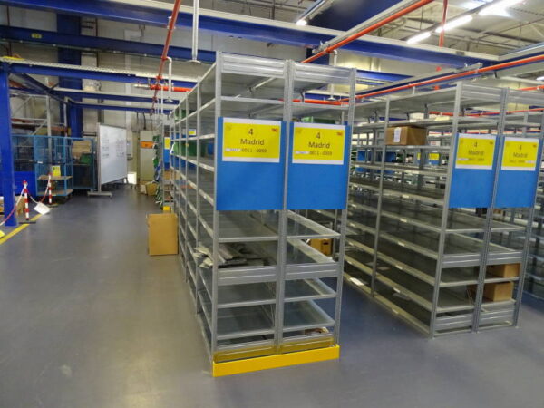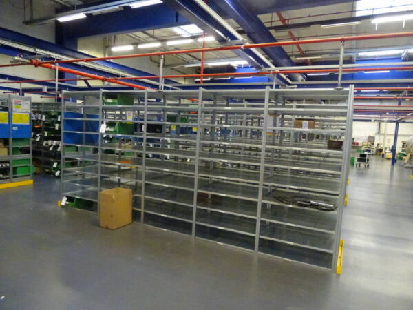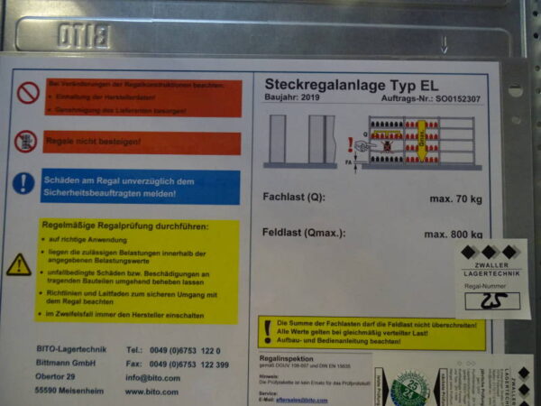 BITO Steckregalanlage mit Ständerhöhe: 230 cm | Ständerbreite: 53 cm | Traversenlänge: 100 cm | Baujahr 2019| Felder: 10 | Ebenen: 10 | max. Fachlast: 70 kg | max. Feldlast: 800 kg | Farbe: silber | Zubehör: teilweise mit Anfahrschutz