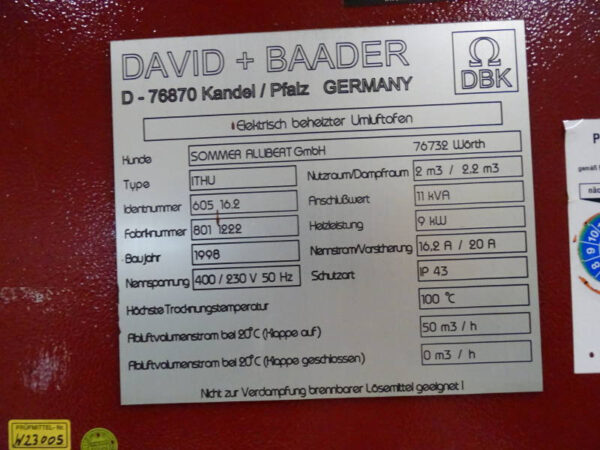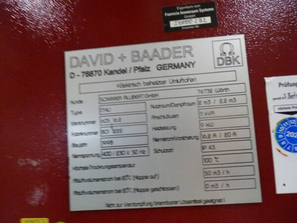 Umluftofen DAVID+BAADER IHTU, Nutzraum 2,1 m³, Baujahr 1998, Trocknungstemperatur 100 °C