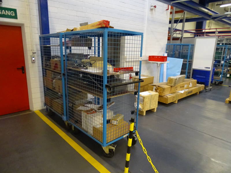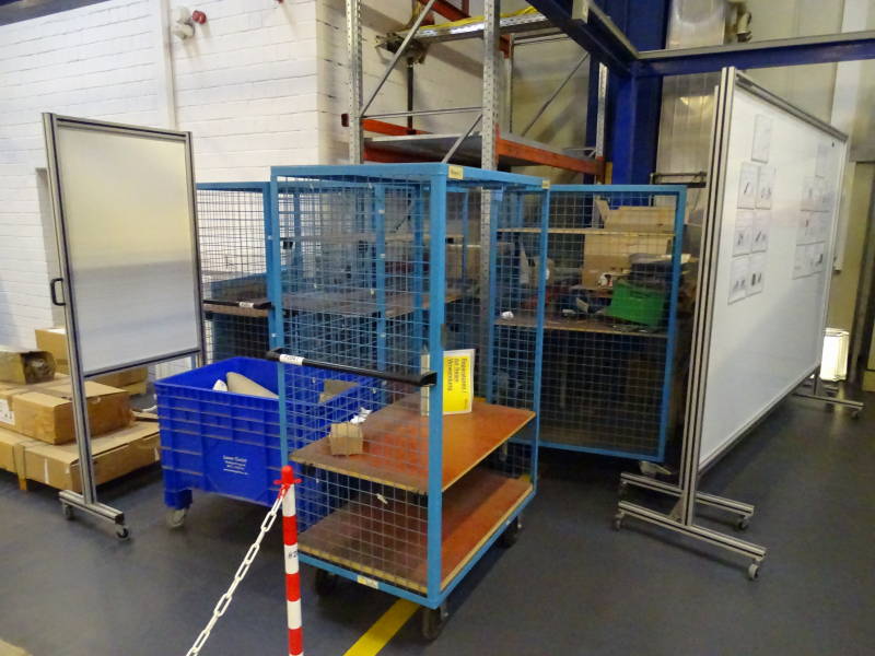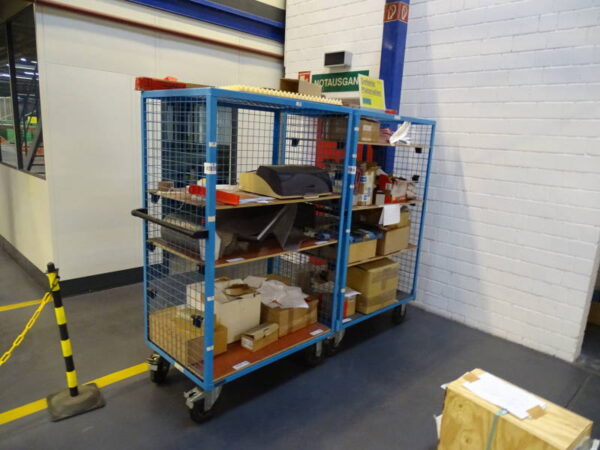 Metall/Holz, Gitterschutzeinhausung, unterschiedliche Anzahl Ablagen, Eigengewicht 85 kg, Traglast 500 kg. Breite x Tiefe x Höhe 105 x 70 x 178 cm, ca. 6 mal vorhanden