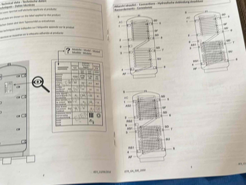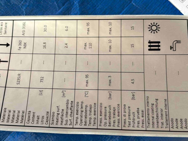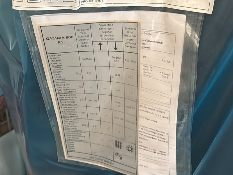 GAMMA 800 R1 Warmwasser-/Pufferspeicher mit Wärmetauscher, SN WO2021071804, Pufferspeicher/Kombispeicher GAMMA 800 R1, 732 Liter Speicherinhalt, Material S235JR, 1 Wärmetauscher (Serpentine) aus Fe 360 NBK mit 16,8 Liter Inhalt und 2,4 m² Heizfläche, Brauchwasser 30 Liter (AISI 316L), max. Betriebstemp. Speicher 95°C / Wärmetauscher 110°C, max. Betriebsdruck Speicher 3 bar / Wärmetauscher 10 bar, Prüfdruck 4,5/15 bar, Code GA00800R1.00_4, Production Nr. WO2021071804