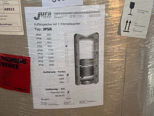 Juratherm JPSR 825 Pufferspeicher, neuwertig, Baujahr 2023, Hochleistungs-Pufferspeicher mit 1 Waermetauscher, 825 Liter (netto 694 l), Polyestervlies-Isolierung silber, Durchmesser 790mm ohne Isolierung, Hoehe ca. 1690mm ohne Isolierung