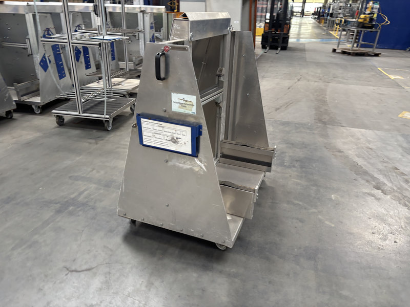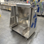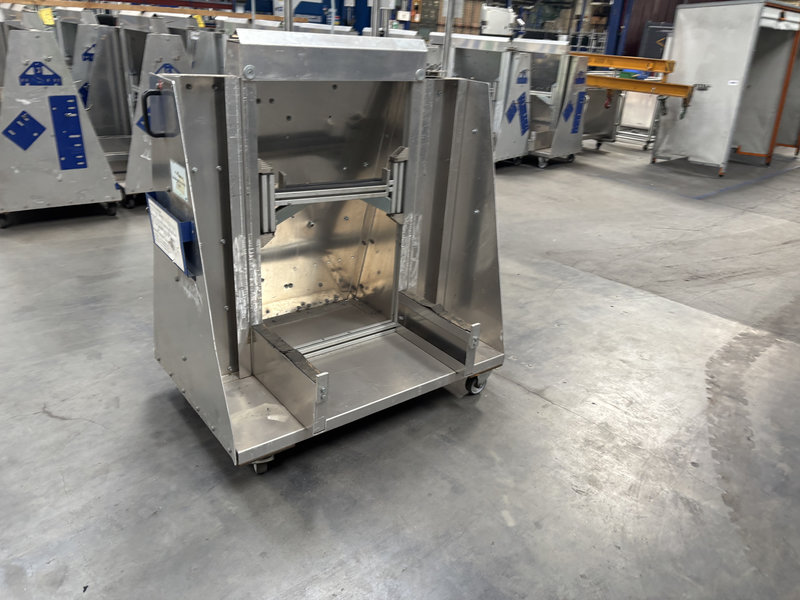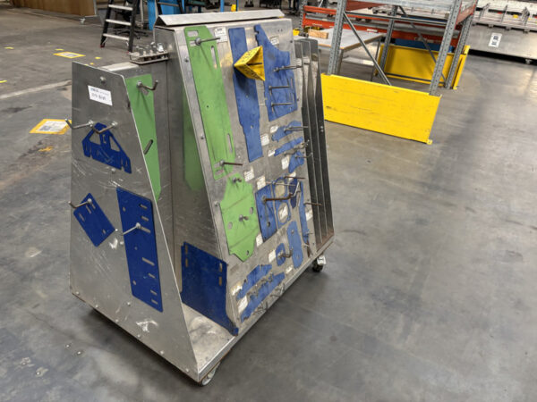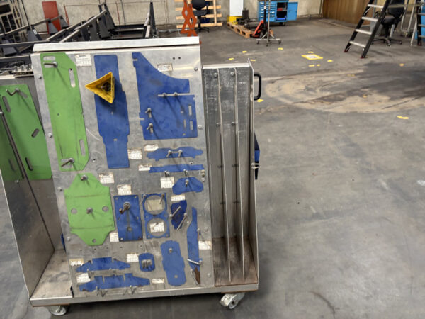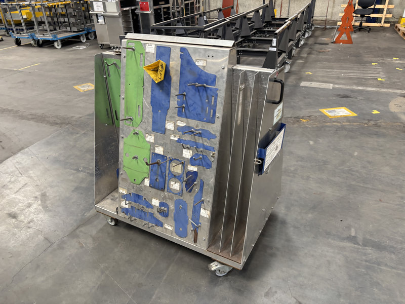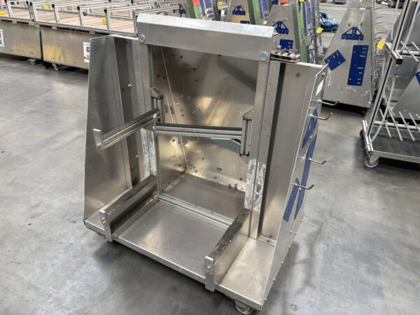 Kommissionierwagen, Pyramidenform, Länge 140 cm, Breite unten 90 cm, Höhe 140 cm. Schiebegriff, ausklappbare Kragarme, Stahlblech