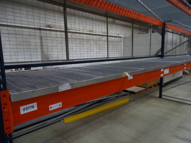 MECALUX Schwerlastregal / Palettenregal mit Ständerhöhe: 400 cm | Ständerbreite: 110 cm | Traversenlänge: 490 cm | | Felder: 2 | Ebenen: 2 | max. Fachlast: 1000 kg | max. Feldlast: 2000 kg | Farbe: blau, orange | Zubehör: Gitterrostböden, Anfahrschutz, Rückwandgitter