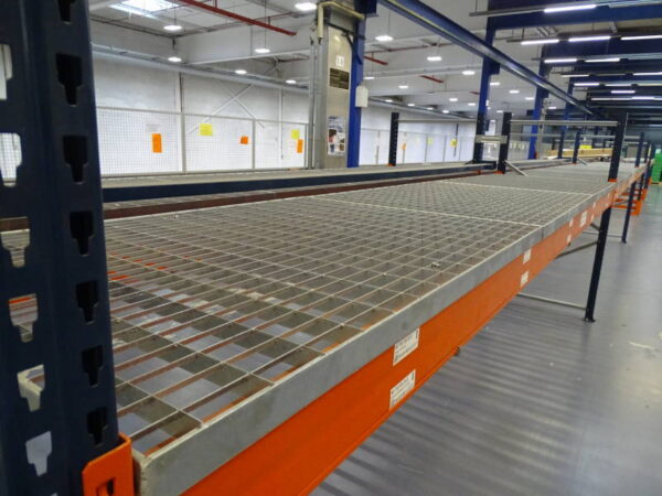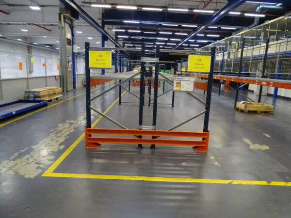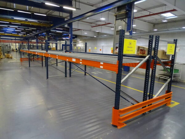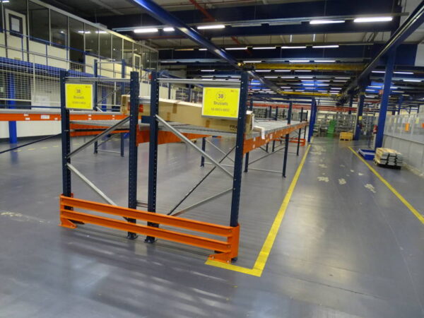 MECALUX Schwerlastregal / Palettenregal als Doppelregal mit Ständerhöhe: 202 cm | Ständerbreite: 110 cm | Traversenlänge: 490 cm | | Felder: 6 | Ebenen: 1 | max. Fachlast: 1500 kg | max. Feldlast: 1500 kg | Farbe: blau, orange | Zubehör: Gitterrostböden, Anfahrschutz, Doppelregalverbinder