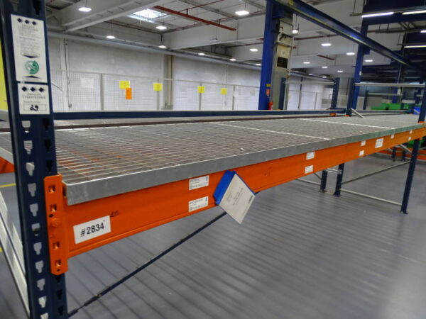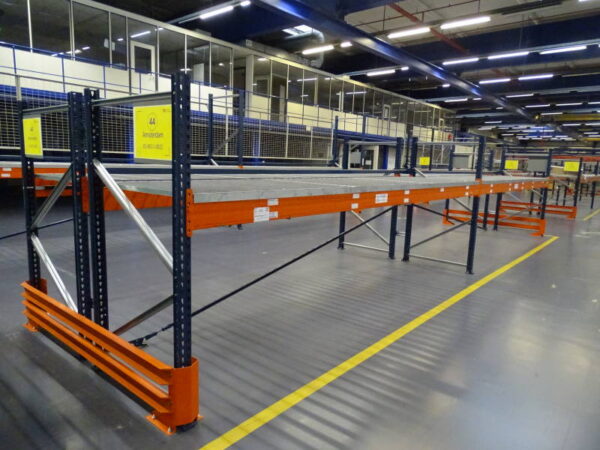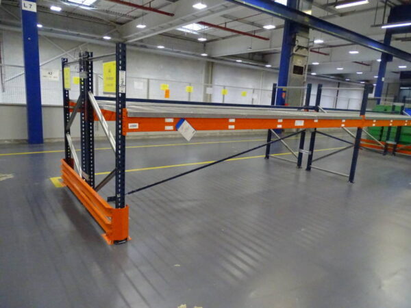 MECALUX Schwerlastregal / Palettenregal als Doppelregal mit Ständerhöhe: 202 cm | Ständerbreite: 110 cm | Traversenlänge: 490 cm | | Felder: 4 | Ebenen: 1 | max. Fachlast: 1500 kg | max. Feldlast: 1500 kg | Farbe: blau, orange | Zubehör: Gitterrostböden, Anfahrschutz, Doppelregalverbinder