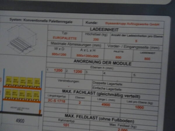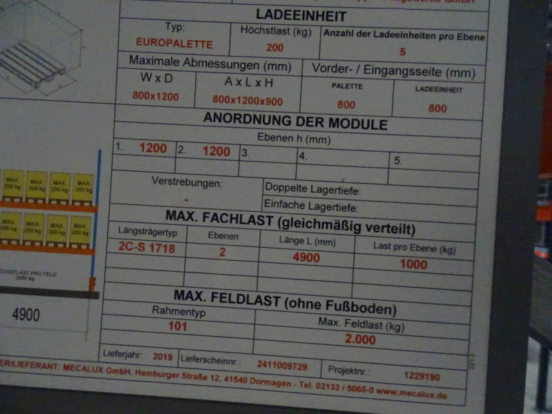 MECALUX Schwerlastregal mit Ständerhöhe: 400 cm | Ständerbreite: 110 cm | Traversenlänge: 490 cm | | Felder: 4 | Ebenen: 2 | max. Fachlast: 1000 kg | max. Feldlast: 2000 kg | Farbe: blau, orange | Zubehör: Gitterrostböden, Anfahrschutz