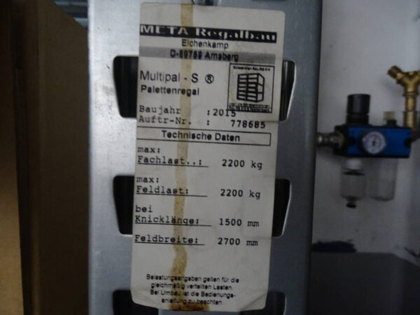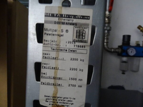 META Multipal-S Schwerlastregal mit Ständerhöhe: 220 cm | Ständerbreite: 110 cm | Traversenlänge: 270 cm | | Felder: 2 | Ebenen: 1 | max. Fachlast: 2200 kg | max. Feldlast: 2200 kg | Farbe: silber, orange | Zubehör: Gitterrostböden, Anfahrschutz