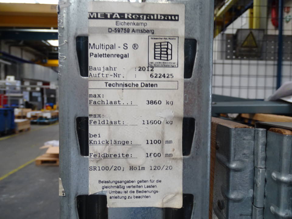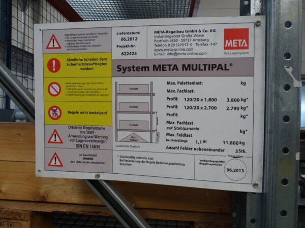 META Multipal Schwerlastregal / Palettenregal mit Ständerhöhe: 420 cm | Ständerbreite: 120 cm | Traversenlänge: 270 cm | | Felder: 2 | Ebenen: 4 | max. Fachlast: 3000 kg | max. Feldlast: 6000 kg | Farbe: | Zubehör: Gitterrostböden, Anfahrschutz, Rückwandgitter