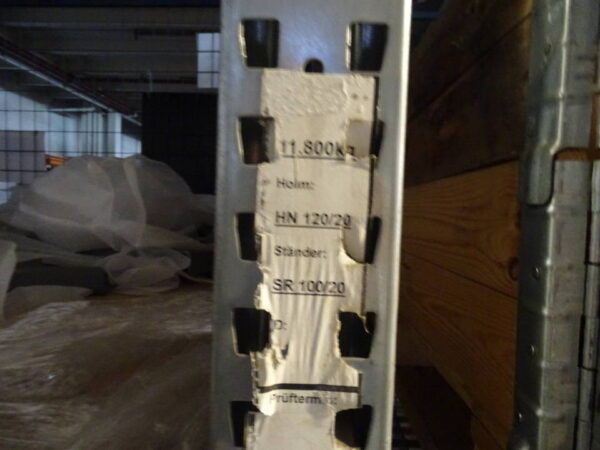 Palettenregal mit Ständerhöhe: 440 cm | Ständerbreite: 120 cm | Traversenlänge: 270 cm | Felder: 3 | Ebenen: 3 | max. Fachlast: 2790 kg | max. Feldlast: 11800 kg | Farbe: silber, orange | Zubehör: Gitterrostböden, Anfahrschutz Rückwandgitter