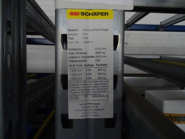 SCHÄFER KDR Durchlaufregal mit Rollenbahnen mit Ständerhöhe: 250 cm | Ständerbreite: 1050 cm | Traversenlänge: 270 cm | Gesamthöhe mit Rückwandgitter 350 cm| Felder: 1 | Ebenen: 6 | max. Fachlast: 780 kg | max. Feldlast: 4680 kg | Farbe: silber, blau | Zubehör: Anfahrschutz, Rückwandgitter