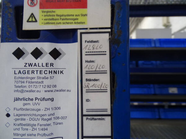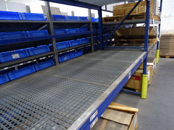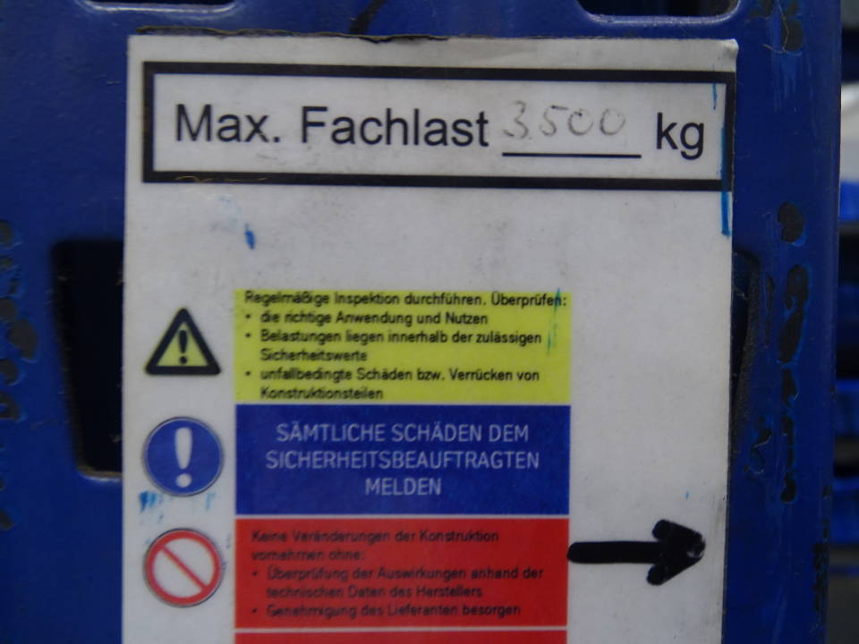 Schwerlastregal / Palettenregal mit Ständerhöhe: 420 cm | Ständerbreite: 110 cm | Traversenlänge: 270 cm | | Felder: 2 | Ebenen: 3 | max. Fachlast: 3500 kg | max. Feldlast: 12820 kg | Farbe: blau | Zubehör: Gitterrostböden, Anfahrschutz, Rückwandgitter