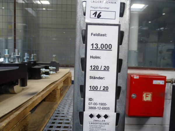 Schwerlastregal / Palettenregal mit Ständerhöhe: 380 cm | Ständerbreite: 120 cm | Traversenlänge: 270 cm | | Felder: 4 | Ebenen: 3 | max. Fachlast: 3000 kg | max. Feldlast: 13000 kg | Farbe: | Zubehör: teilweise Gitterrostböden