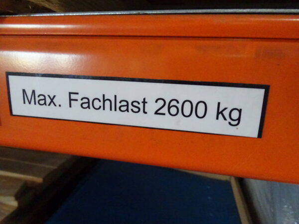 Schwerlastregal / Palettenregal mit Ständerhöhe: 590 cm | Ständerbreite: 110 cm | Traversenlänge: 270 cm | Baujahr 2014| Felder: 3 | Ebenen: 4 | max. Fachlast: 2600 kg | max. Feldlast: 12000 kg | Farbe: | Zubehör: Gitterrostböden, Anfahrschutz