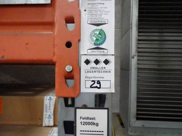 Schwerlastregal mit Ständerhöhe: 220 cm | Ständerbreite: 120 cm | Traversenlänge: 270 cm | mit Höhenbegrenzungslatten| Felder: 2 | Ebenen: 3 | max. Fachlast: 3000 kg | max. Feldlast: 12000 kg | Farbe: silber, orange | Zubehör: Gitterrostböden, Anfahrschutz