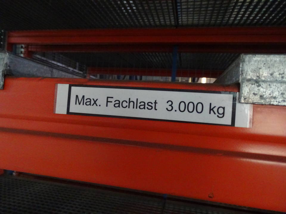 Schwerlastregal mit Ständerhöhe: 440 cm | Ständerbreite: 120 cm | Traversenlänge: 270 cm | | Felder: 1 | Ebenen: 6 | max. Fachlast: 3760 kg | max. Feldlast: 12690 kg | Farbe: silber, orange | Zubehör: Gitterrostböden, Anfahrschutz