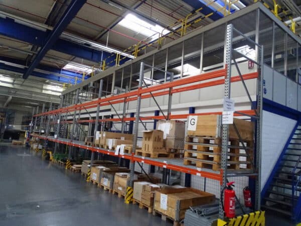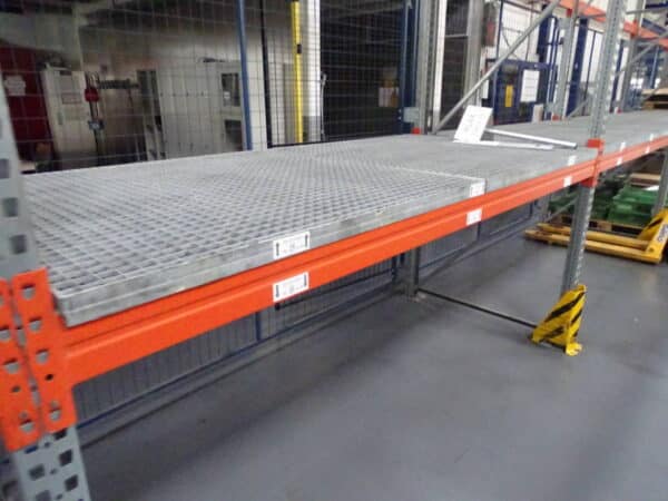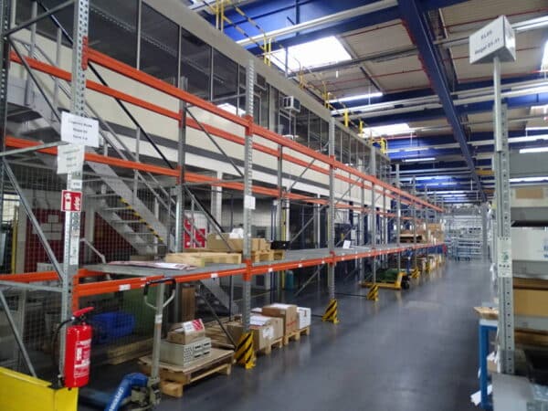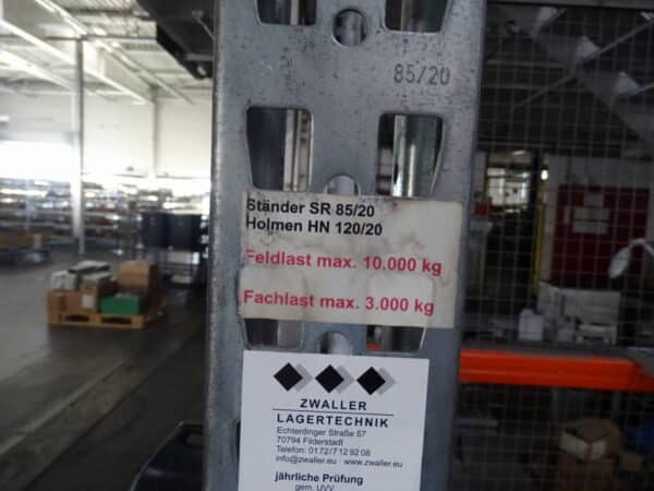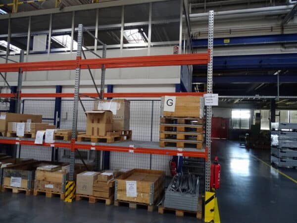 Schwerlastregal mit Ständerhöhe: 380 cm | Ständerbreite: 120 cm | Traversenlänge: 7 x 280, 1 x 235 cm | | Felder: 8 | Ebenen: 2 |max. Fachlast: 3000 kg | max. Feldlast: 10000 kg | Farbe: silber, orange | Zubehör: Gitterrostböden, Anfahrschutz, Rückwandgitter