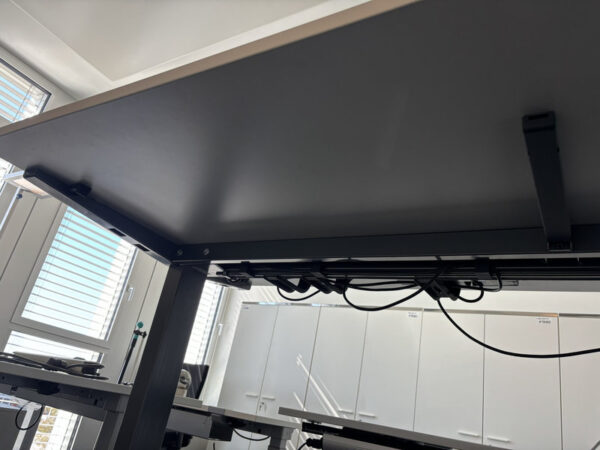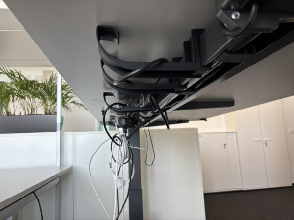 STEELCASE Activa Lift 2, elektrisch höhenverstellbarer Schreibtisch | Gestell grau | Tischplatte lichtgrau | mit Kabelführung