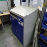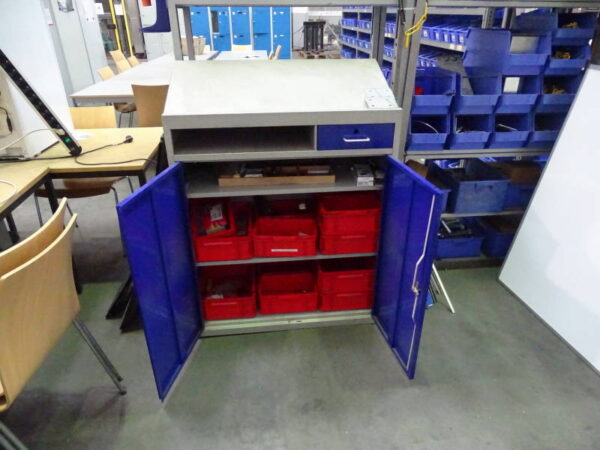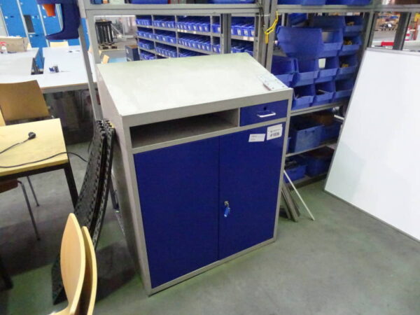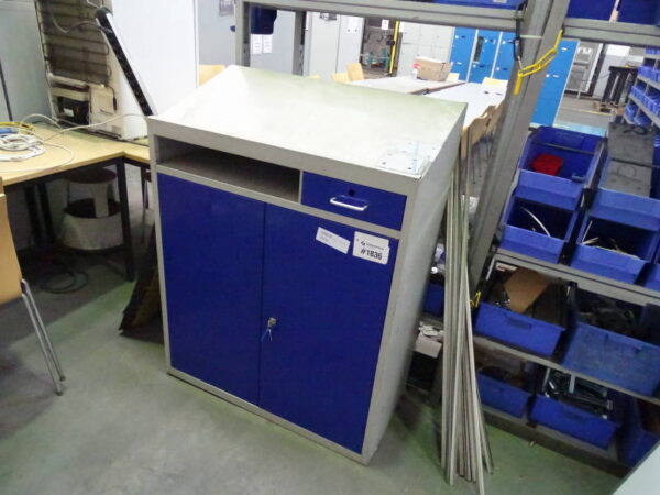 Korpus lichtgrau, Front blau, 2 Flügeltüren, 1 Schublade