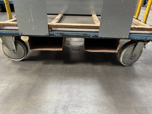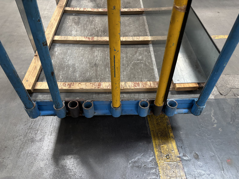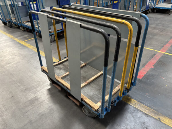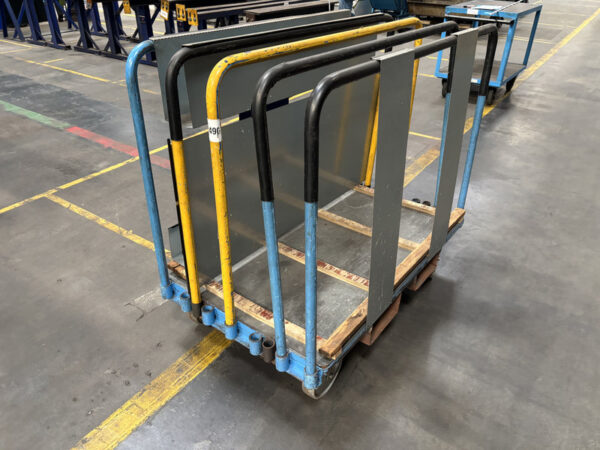 Transportwagen mit verstellbaren Einsteck-Gestellen, Führung für Stapler-Gabel, Länge 130 cm, Breite 84 cm, Höhe Tisch 28 cm, Höhe. Mit Einsteck-Gestellen 117 cm